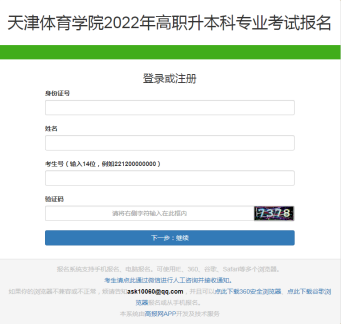 (1)已完成天津市统一报名且报考我校的考生,根据页面提示输入身份证号、姓名、考生号(14位)以及验证码,完成后点击【下一步:继续】。注:考生可通过登录“天津招考资讯网站--公众服务大厅--网上报名”窗口进行《考生报名确认表》的下载、查阅考生号等相关信息。