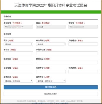 (2)进入信息填报页面,根据页面提示准确输入各项信息,填写完成后点击【提交报名信息】。