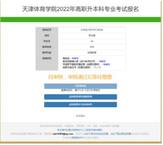 审核通过后,请考生在3月8日-9日登录系统点击【点击完成交费】按钮,进入到天津体育学院网上统一支付平台,输入用户名和密码(用户名为身份证号,密码为身份证后六位(末位为字母X的需大写))完成缴费工作。