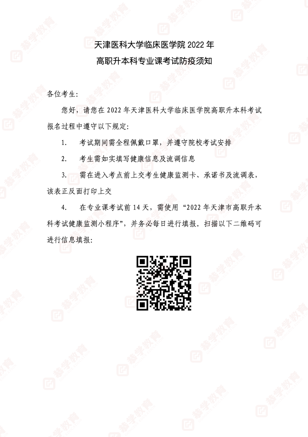 天津专升本|天津医科大学临床医学院2022年高职升本科专业课考试防疫须知