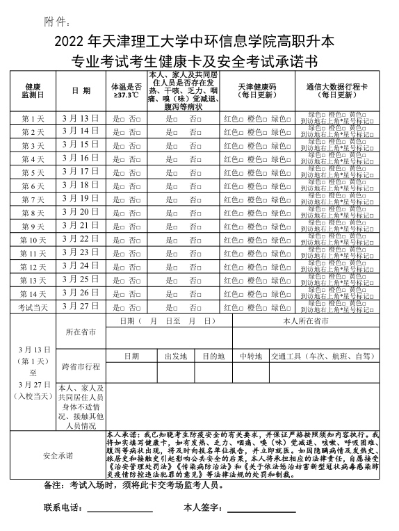 天津专升本|2022年天津理工大学中环信息学院高职升本科考试健康卡及安全承诺书