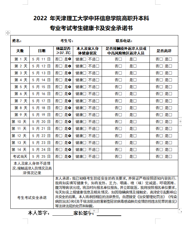 天津专升本|2022 年天津理工大学中环信息学院高职升本科专业考试考生健康卡及安全承诺书