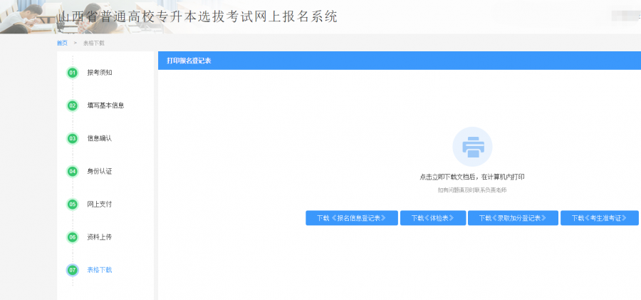 4.点击左侧“表格下载”,选择“下载《考生准考证》”,下载后直接打印即可。