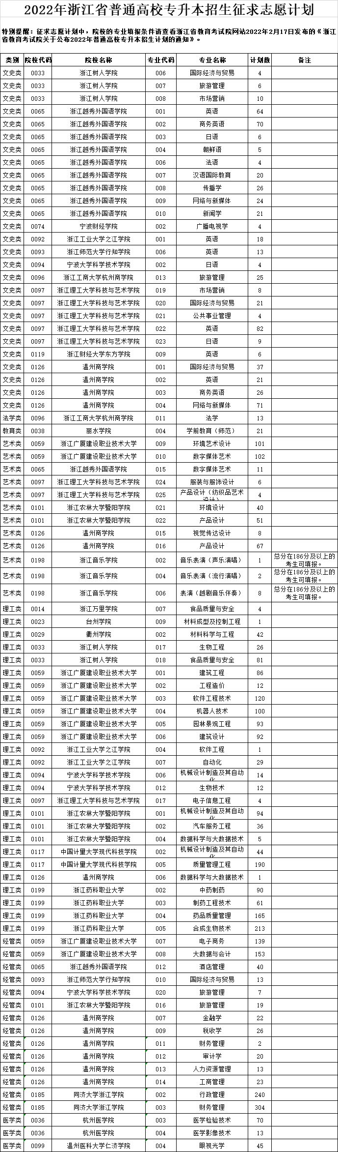 五、征求志愿计划中,院校的专业填报条件请查看浙江省教育考试院网站2022年2月17日发布的《浙江省教育考试院关于公布2022年普通高校专升本招生计划的通知》。