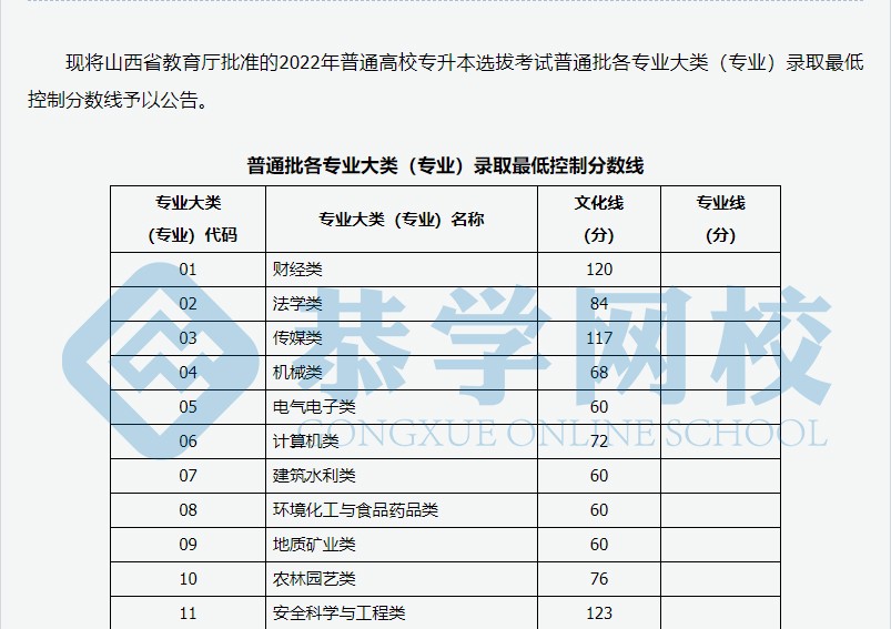 【录取最低分】2022年山西专升本各专业大类录取最低控制分数线公告