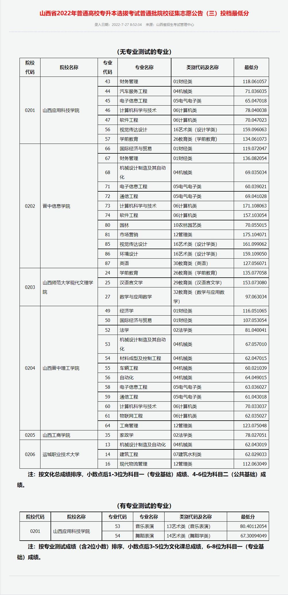 山西专升本 | 2022年山西专升本院校征集志愿(三)投档最低分