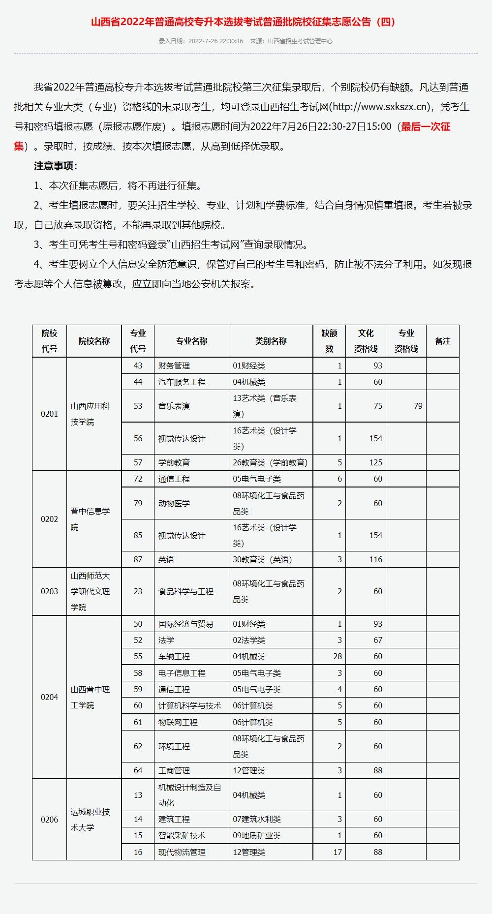 山西专升本 | 2022年山西专升本院校征集志愿(四)