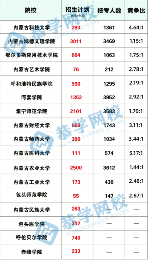 (2022年内蒙古统招专升本各招生院校报考招生数据)