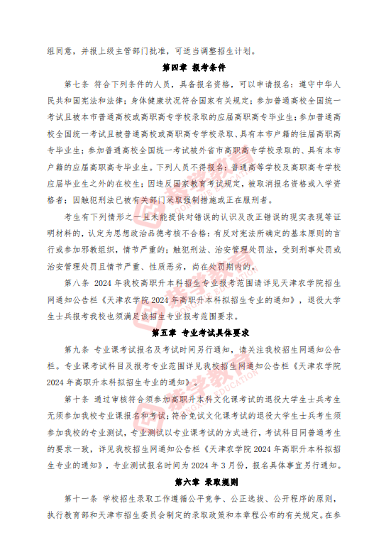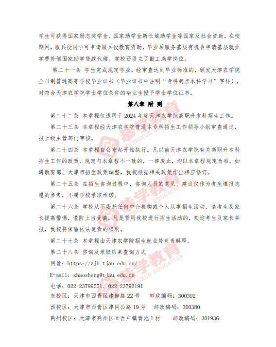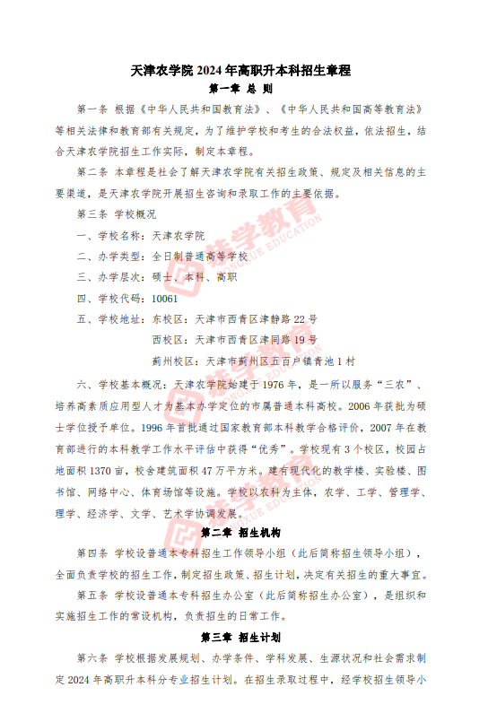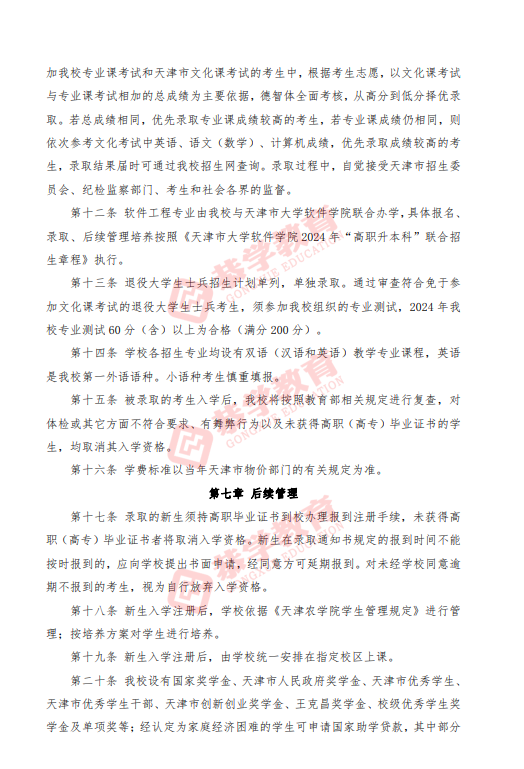 11月23日,天津教育招生考试院公布了2024年天津高职升本科最新资讯,其中2024年各院系高职升本科招生章程已出,为了更好的服务志愿为农学院的天津专升本学子,恭学教育整理了该院校招生章程,跟着小编一起来看看吧!