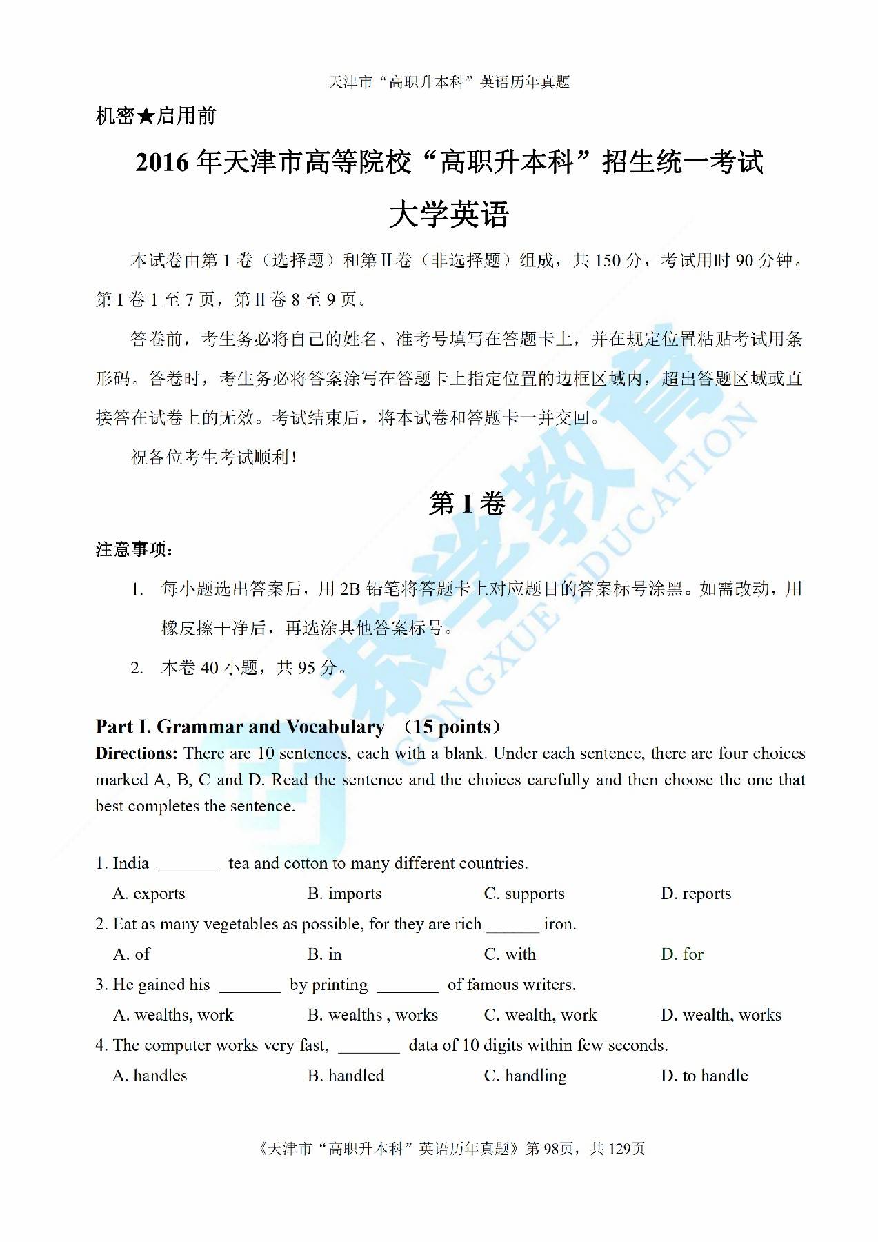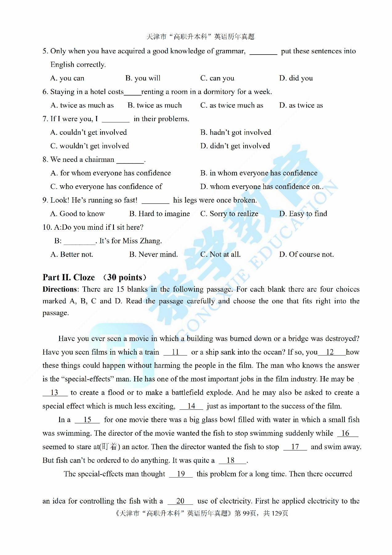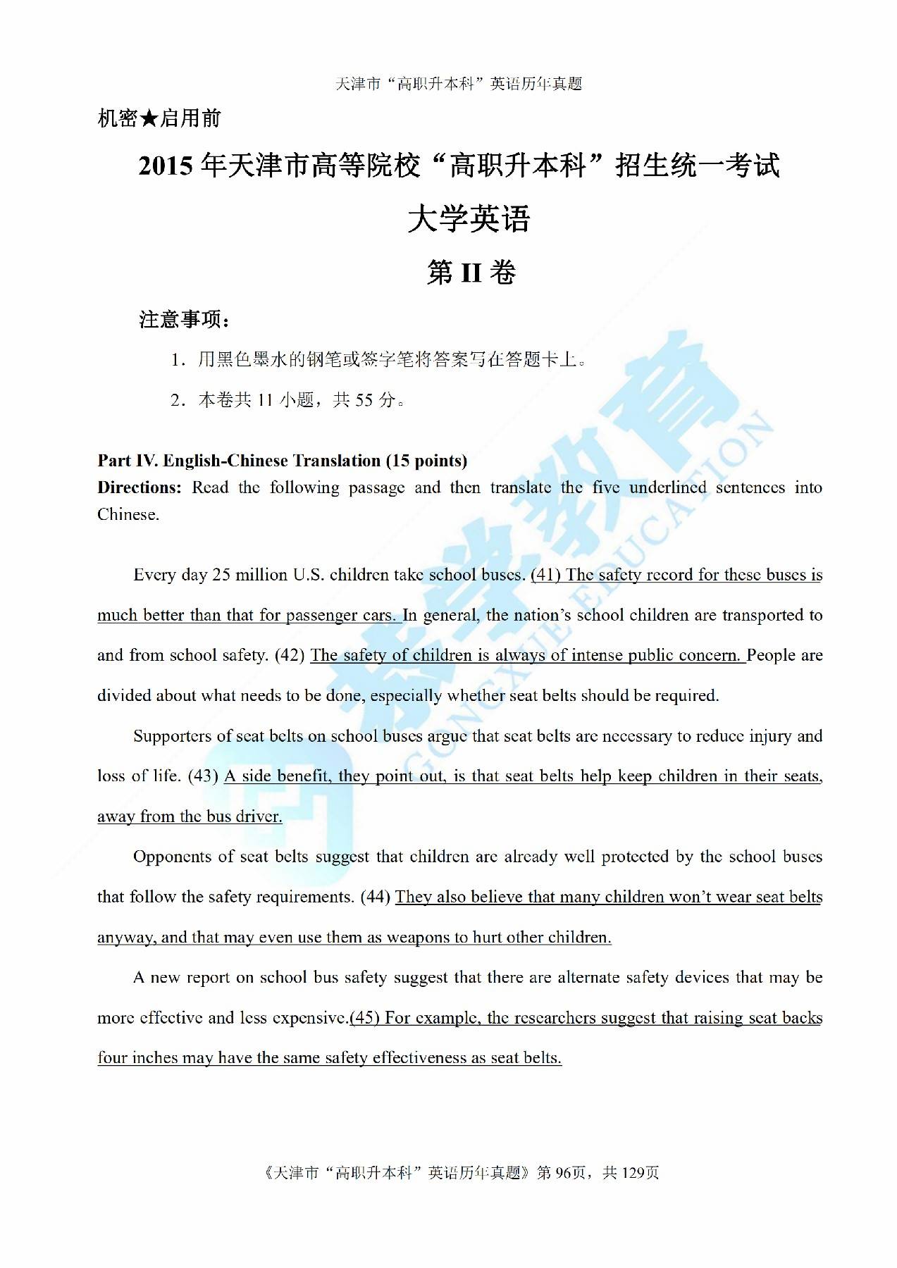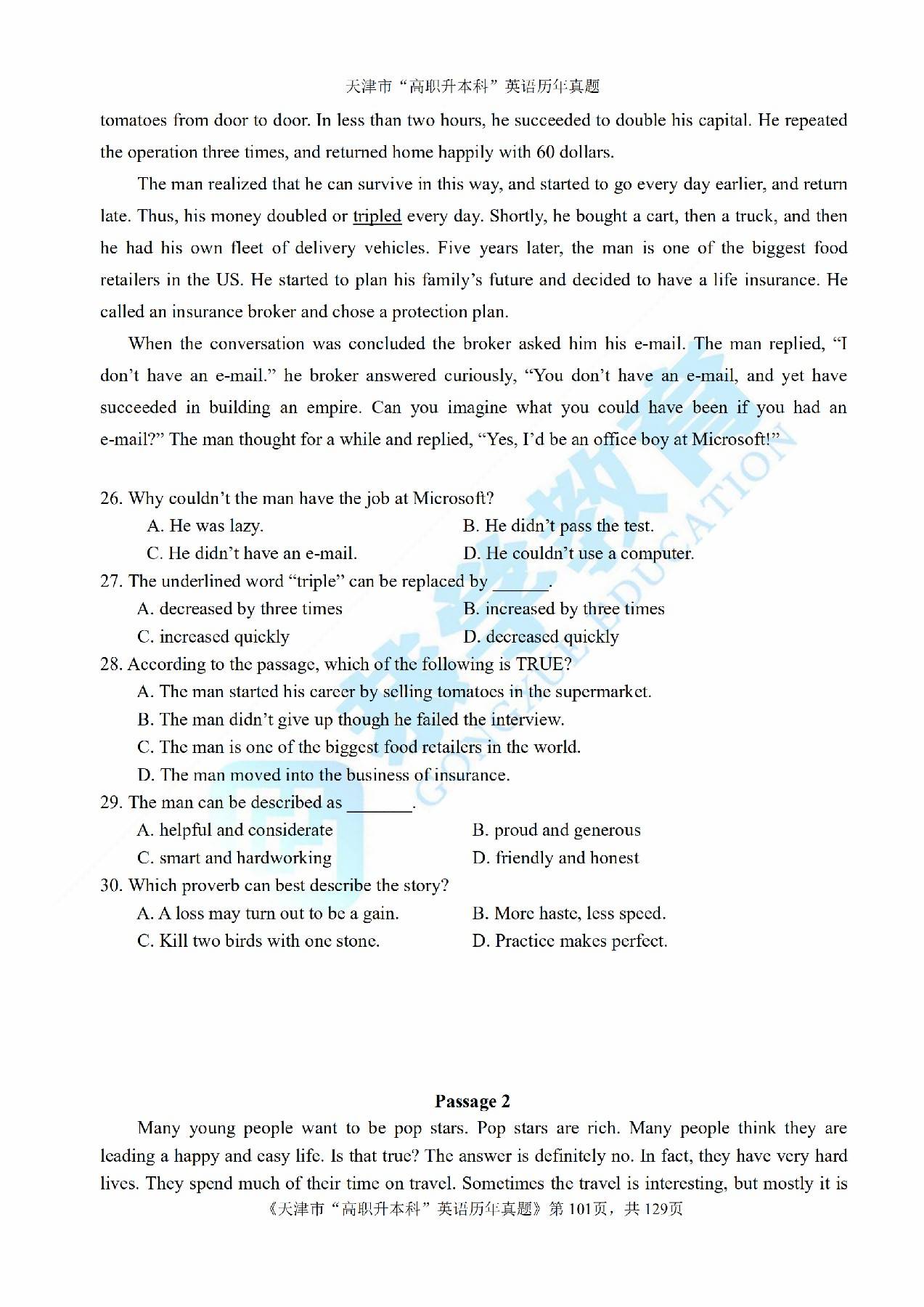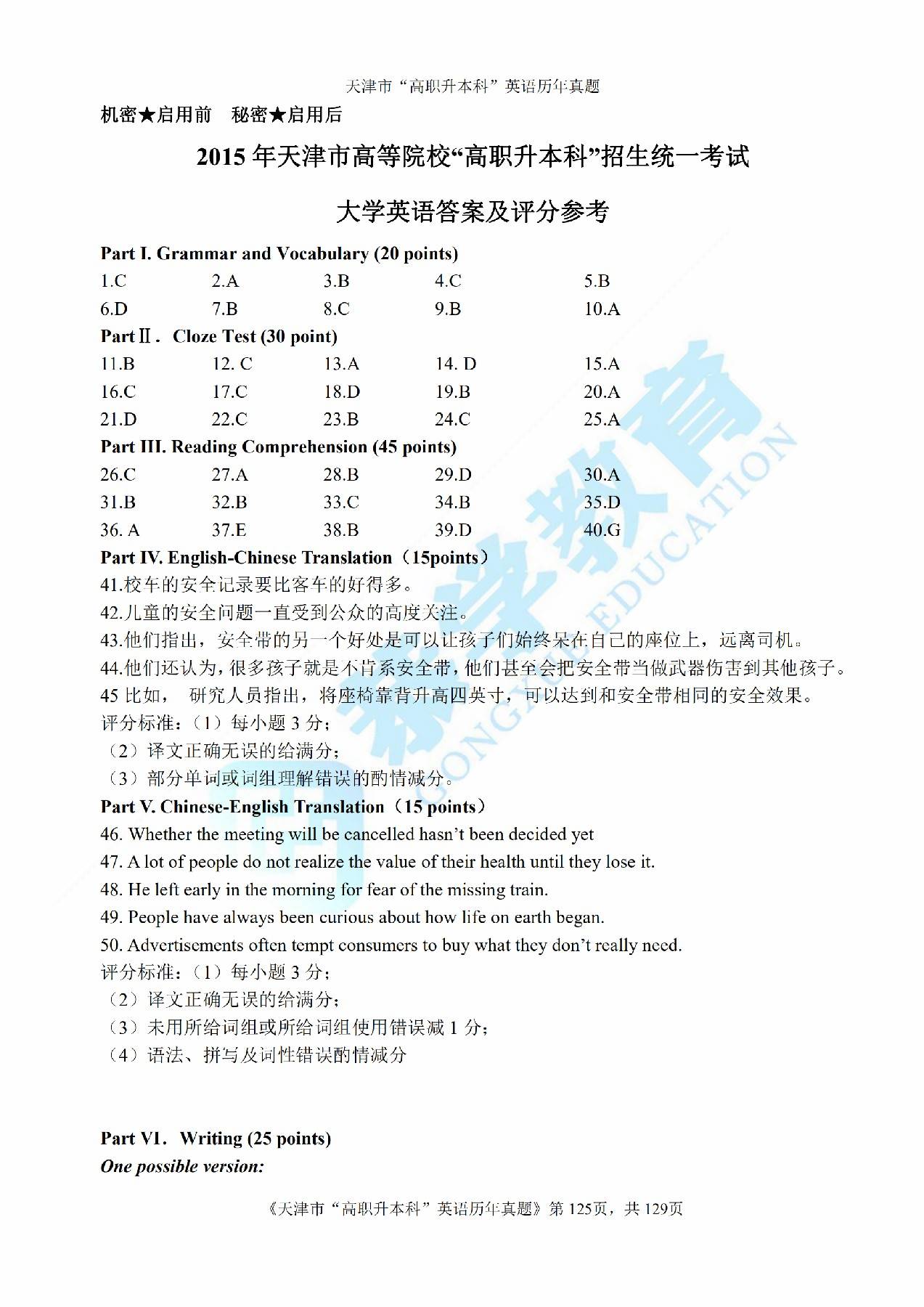 2015年天津市高等院校“高职升本科”招生统一考试高等英语真题及答案