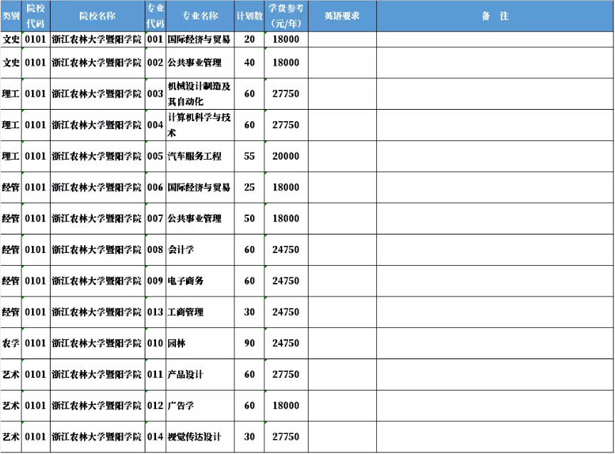 浙江农林大学暨阳学院前身为浙江林学院天目学院,是2000年由浙江林学院(浙江农林大学前身)创办,经浙江省人民政府批准的全日制本科独立学院,2004年经教育部重新确认。2011年浙江农林大学与浙江省诸暨市人民政府合作共建、与浙江省诸暨市教育发展投资有限公司合作举办。2013年9月整体从浙江省临安市迁址到诸暨市办学。 诸暨市位于浙江省中北部,北邻杭州,东接绍兴,南连义乌,交通便捷,区位优势明显。诸暨是一座历史悠久的文明之城,是一座人才辈出的人文之城,是一座山水唯美的灵秀之城,是一座经济发达的活力之城,是全国教育工作先进县市、浙江省首批教育强市。素有崇文尚德、耕读传家的千年遗风,非常适合办大学。 目前,学院正沿着“特色立院、创业兴院、创新强院、服务名院”的发展道路,到2020年,努力把学院建设成为省内一流、国内知名的创业型独立学院。二.招生计划