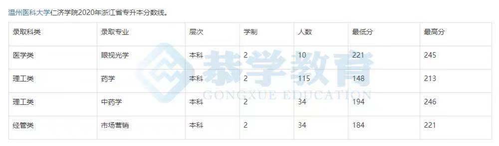 恭学网校|浙江升本院校:温州医科大学仁济学院2020年专升本分数线