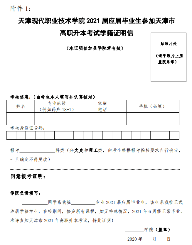 关于2021年天津市高职升本科考试报名工作的通知根据市高招办关于《2021年天津市高职升本科招生实施办法》文件精神,请拟参加2021年高职升本科考试的应届毕业生到所在学院开具学籍证明信(见附件1),于2020年11月24日9:00至11月26日17:00登陆招考资讯网(www.zhaokao.net)履行网上报名手续,并由学生本人按照学校规定时间,携带身份证原件学籍证明信,进行现场确认报名信息,领取考生号并进行电子摄像。现将有关工作提示如下: