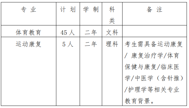 第七条 2021 年高职升本科招生计划为 50 名,其中文科 45 名,理科 5 名,招生专业为体育教育和运动康复专业。