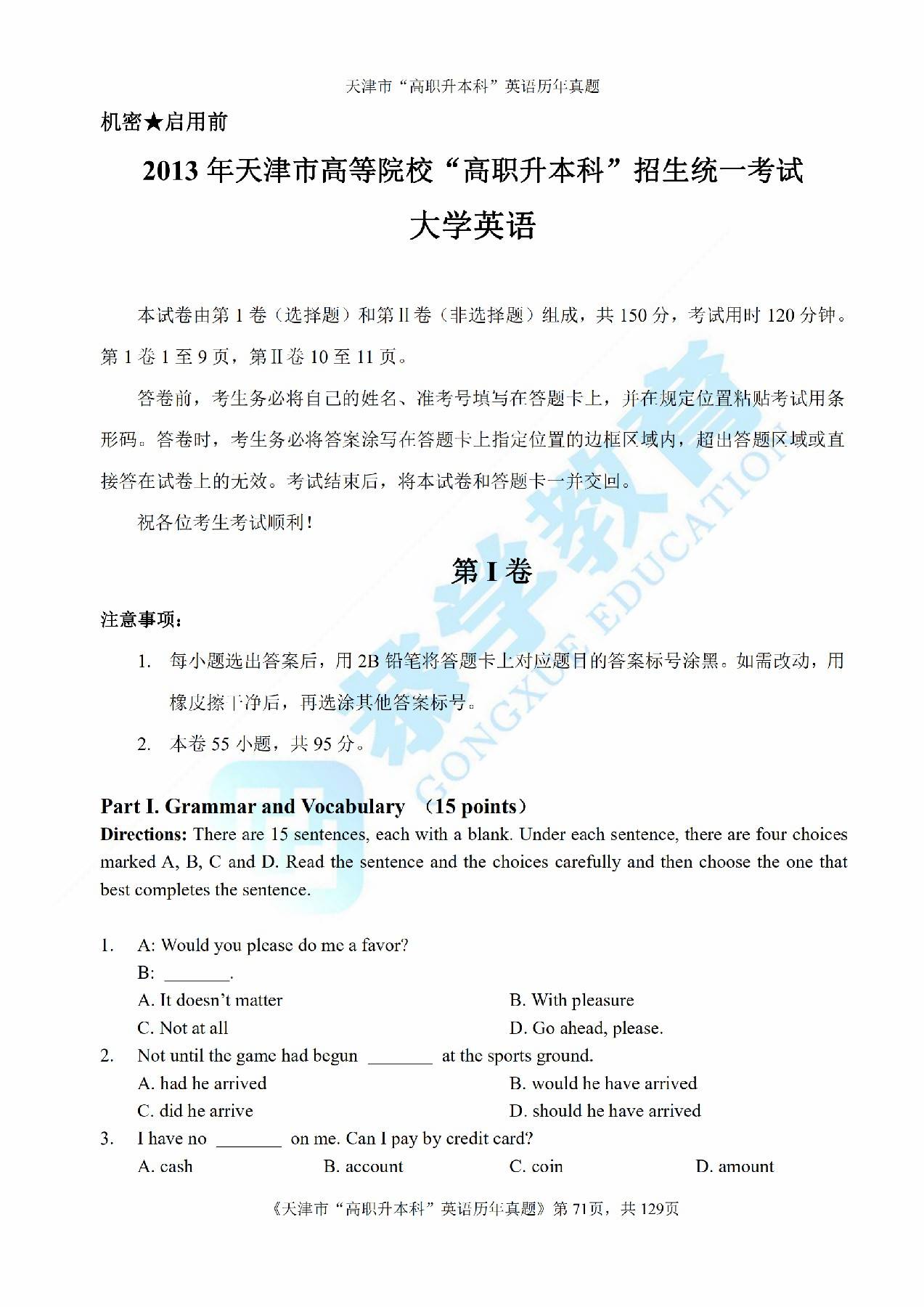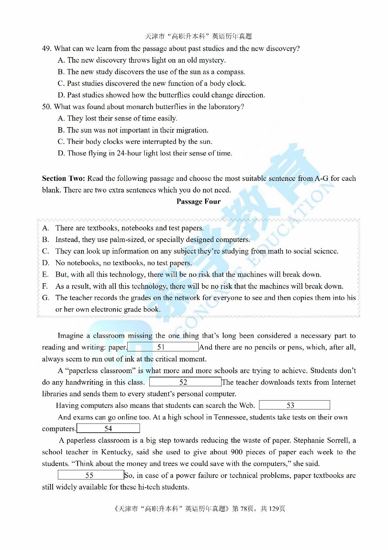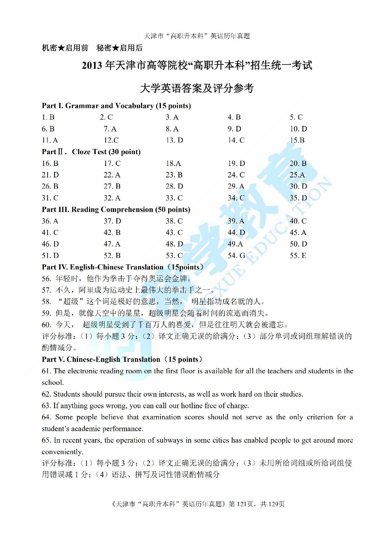 2013年天津市高等院校“高职升本科”招生统一考试高等英语真题及答案