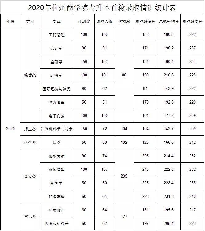 恭学网校|浙江升本院校:浙江工商大学杭州商学院2020年专升本分数线