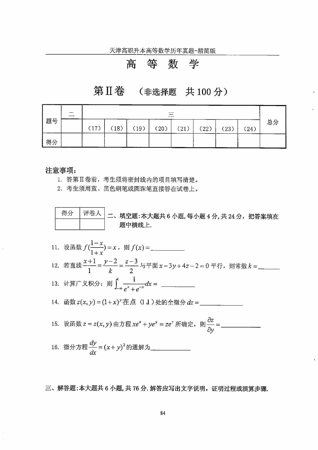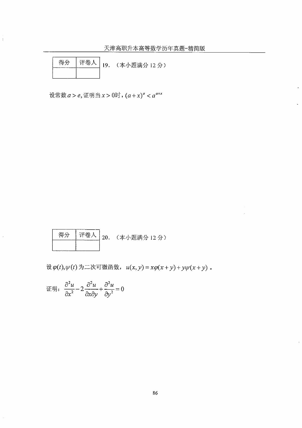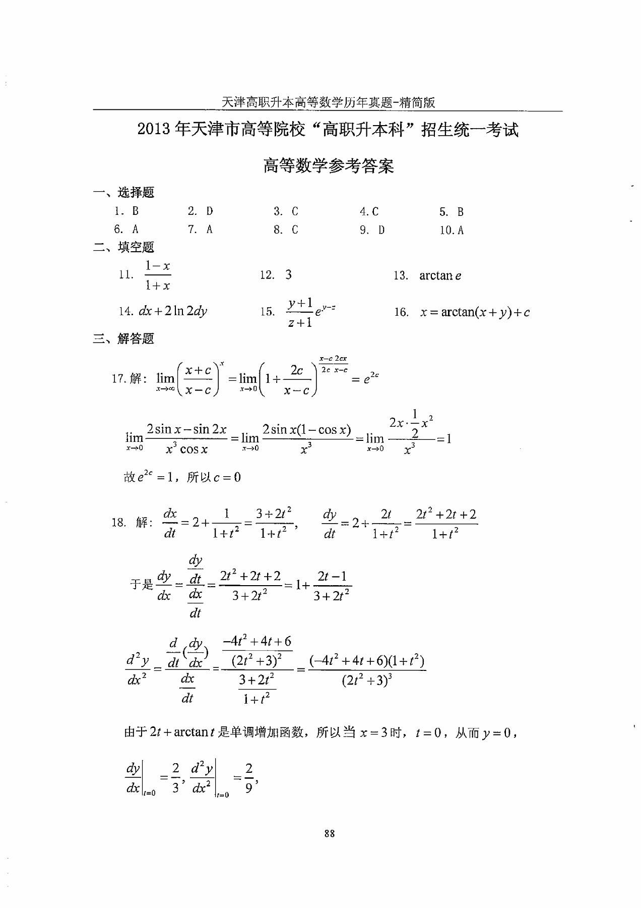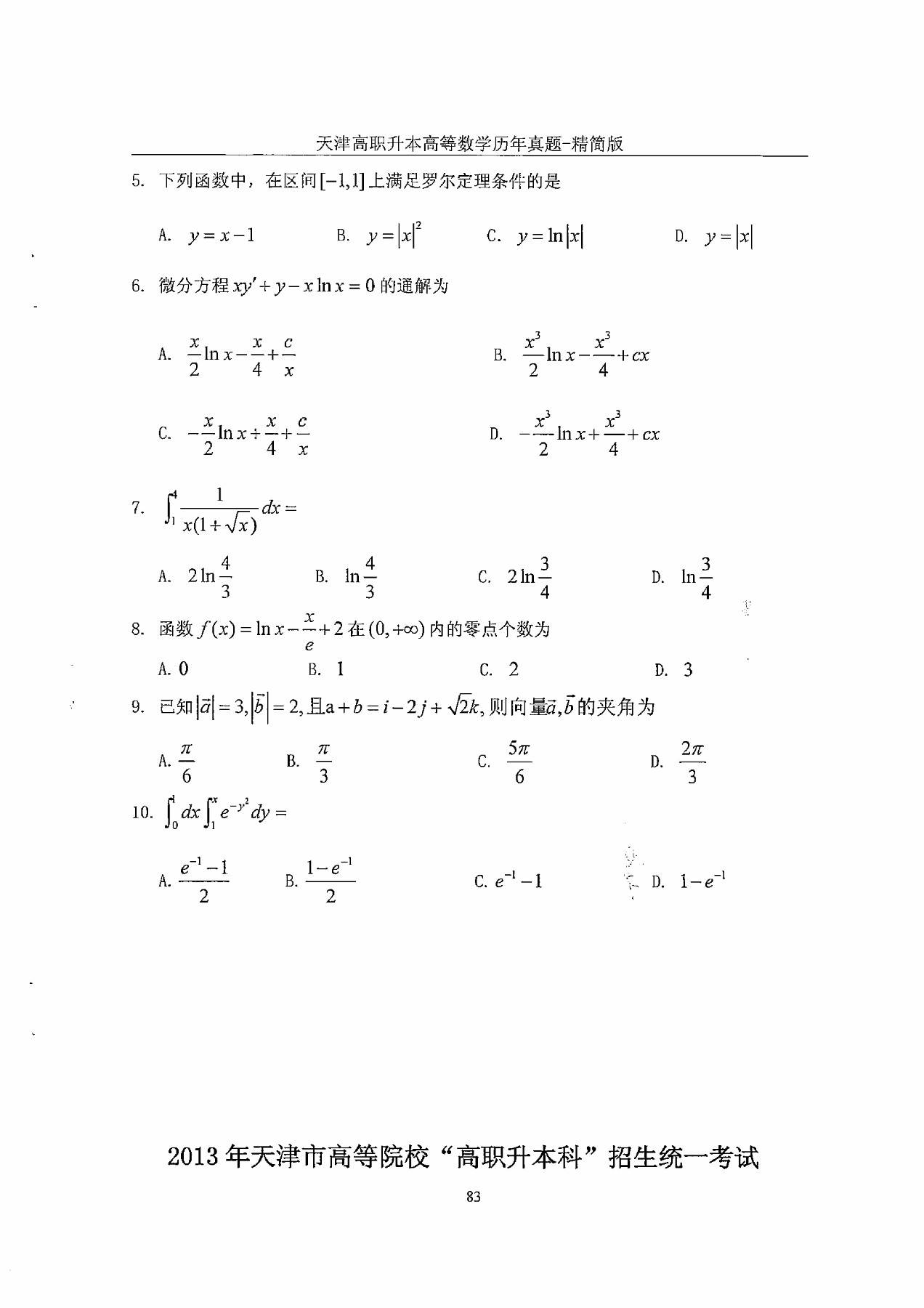 2013年天津市高等院校“高职升本科”招生统一考试高等数学真题及答案