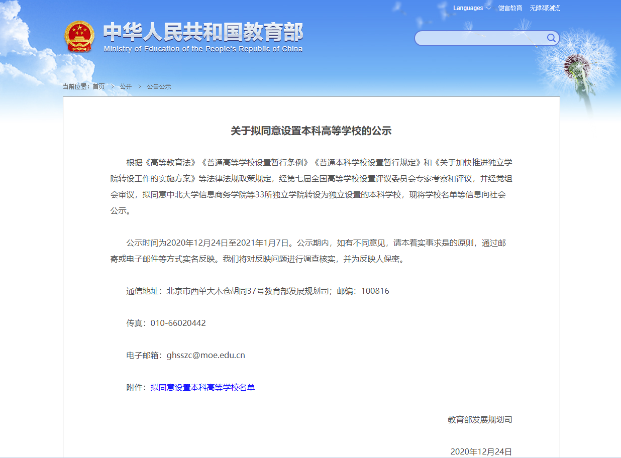 教育部发布《关于拟同意设置本科高等学校的公示》,拟同意中北大学信息商务学院等33所独立学院转设为独立设置的本科院校,现将学校名单等信息向社会公示。