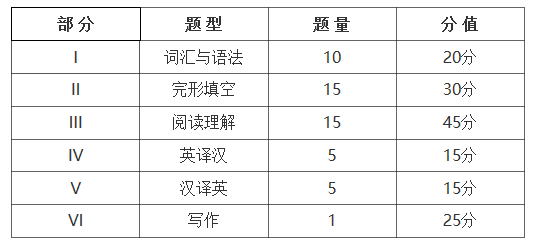 试卷分为第I卷和第II卷两部分。第I卷包含词汇与语法、完形填空、阅读理解三部分,为客观性试题,满分95分;第II卷包含英译汉、汉译英及写作三部分,为主观性试题,满分55分。