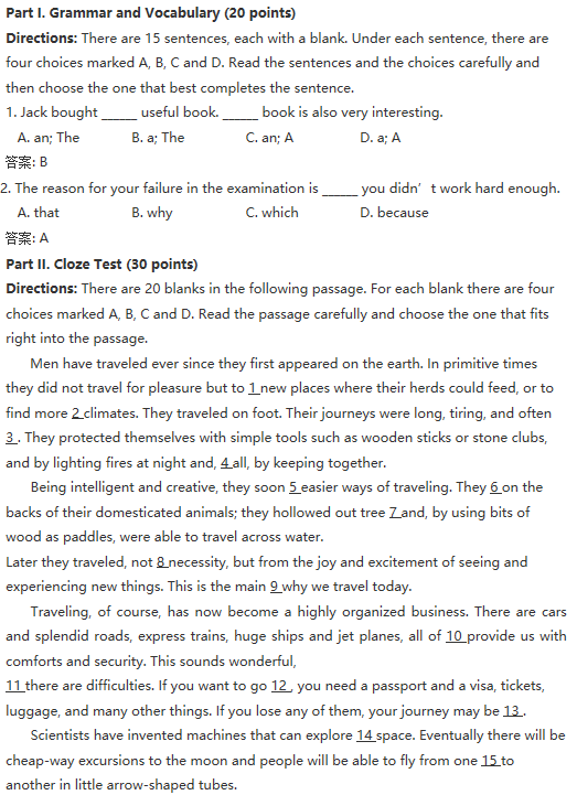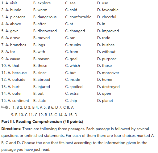 该部分为单项选择题;为考生提供一篇200-250词左右的英语短文。文中留出15个空白,文后为每个空白处留有四个可供选择的词或词组,要求考生在通读全文、领会大意的基础上,从备选词或词组中选出一个最佳选项。