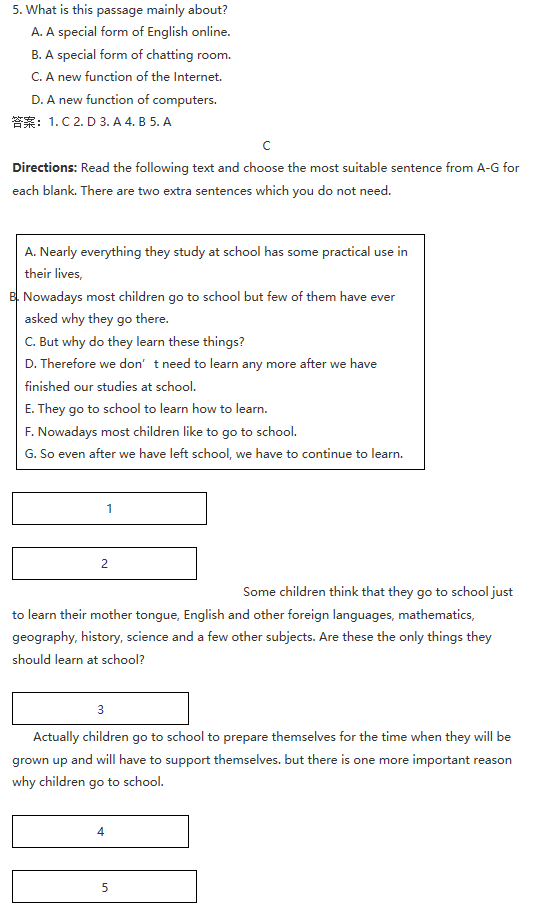 该部分为单项选择题;试卷呈现A、B、C三篇短文,每篇文长300词左右。题材涉及人物传记、社会历史文化知识、日常生活常识以及科普介绍等。其中A、B两篇每篇短文后设5个问题,每个问题有四个备选答案,要求考生根据短文内容,选出一个正确答案。在C篇文章中,文内留出5句空白,文后为5个空白提供7个可供选择的句子,要求考生在通读全文、领会大意的基础上,从7个备选句中选出5个符合文章结构、语意内容及逻辑的选项。(可参照所附题型示例)