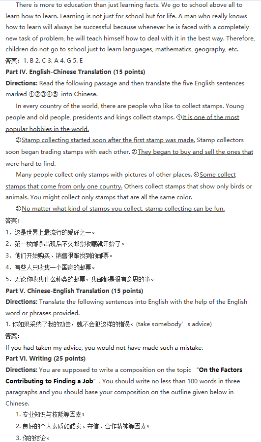 根据题目要求,完成一般性话题的中英文互译任务。其中,英译汉部分中,考生应能在正确理解文章内容的基础上将部分句子译成通顺的汉语;汉译英部分中,考生应能在个别英语词汇的提示下将汉语句子译成通顺的英语。