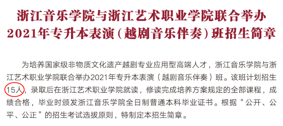 浙江音乐学院再次发文《浙江音乐学院与浙江艺术职业学院联合举办2021年专升本表演(越剧音乐伴奏)班招生简章》