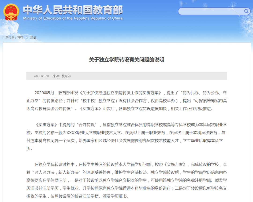 2020年5月,教育部印发《关于加快推进独立学院转设工作的实施方案》,提出了“转为民办、转为公办、终止办学”的转设路径;并针对“校中校”独立学院(没有社会合作方,仅由高校举办),提出“可探索统筹省内高职高专教育资源合并转设”。《实施方案》印发后,各地独立学院转设进度加快,相关工作正在积极推进。