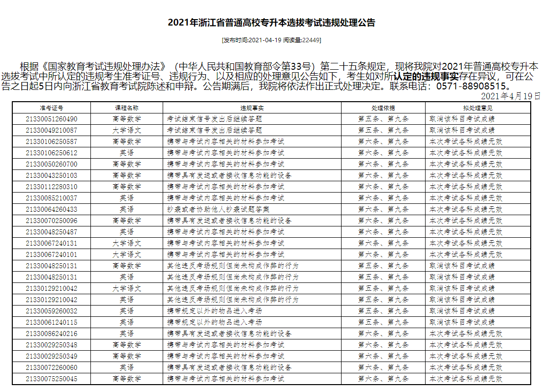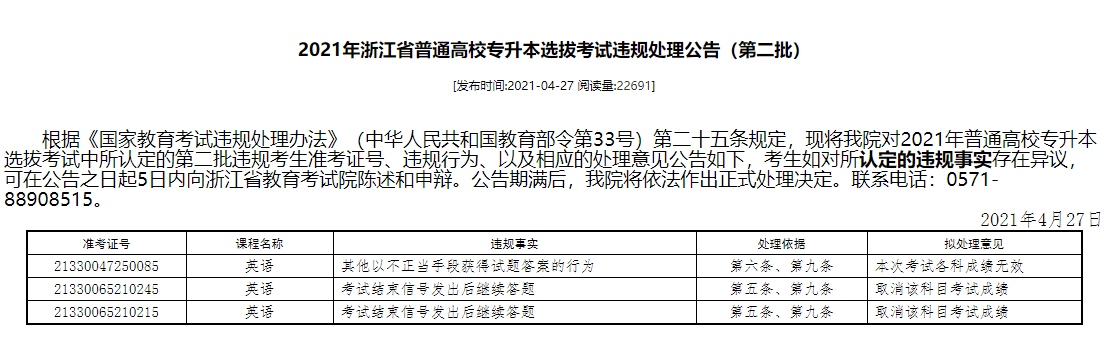 根据浙江省教育考试院消息显示,2021年浙江省普通高校专升本考试刚落幕不久,浙江省教育考试院在官网连续公布了两批共计27位违纪考生。