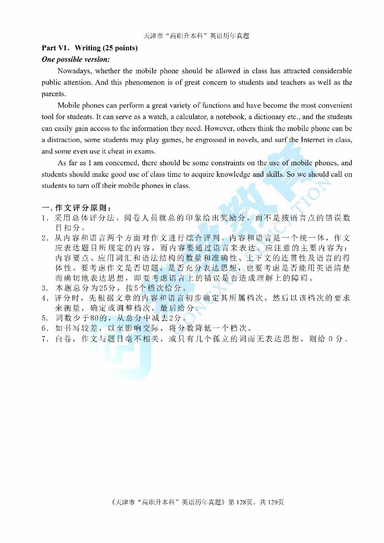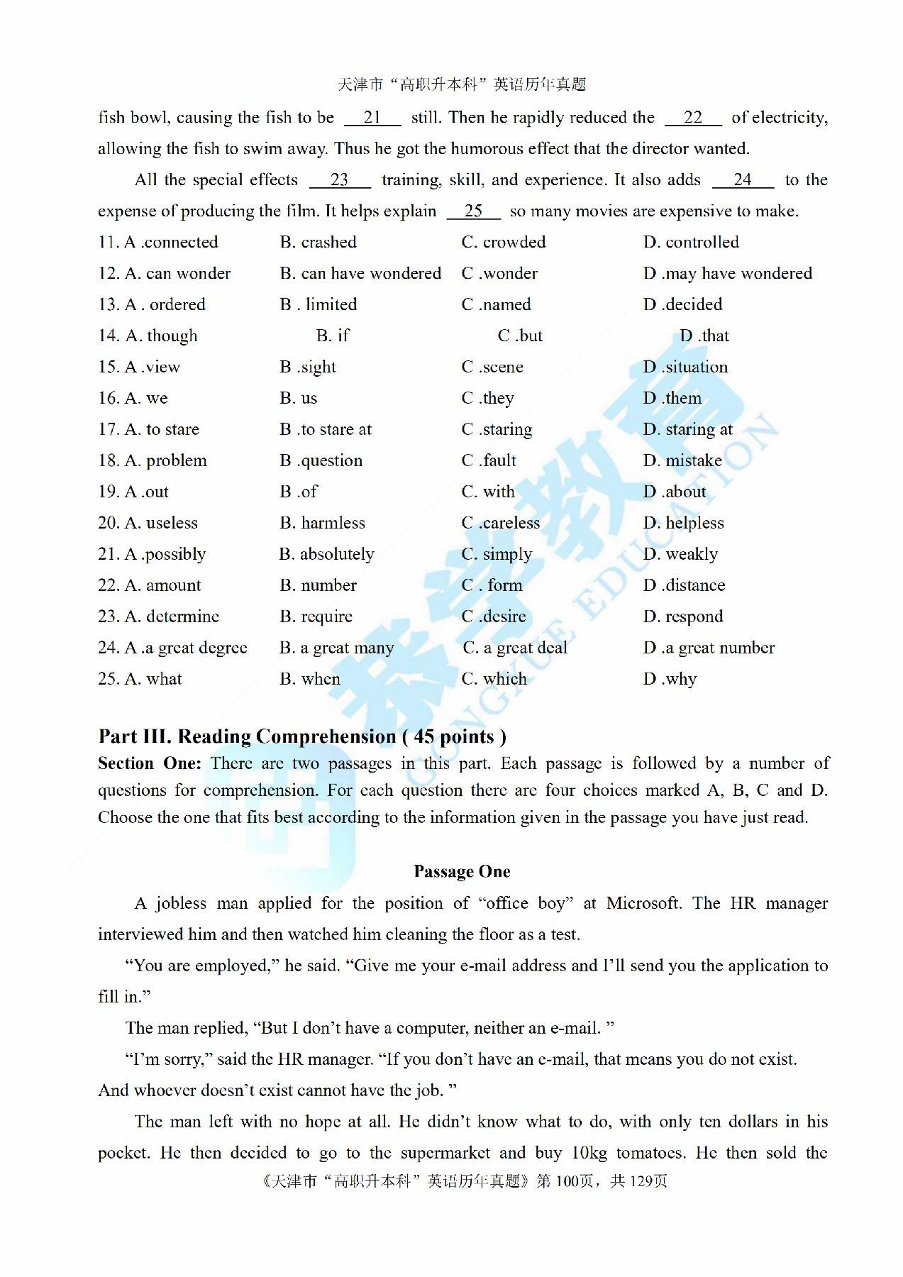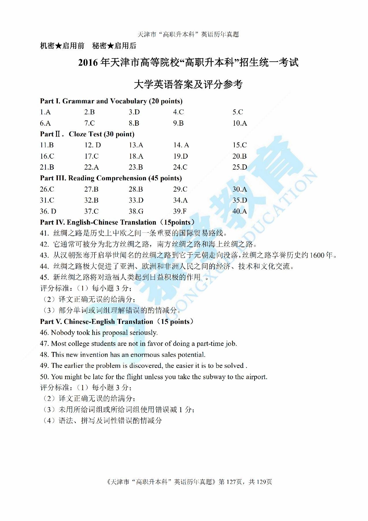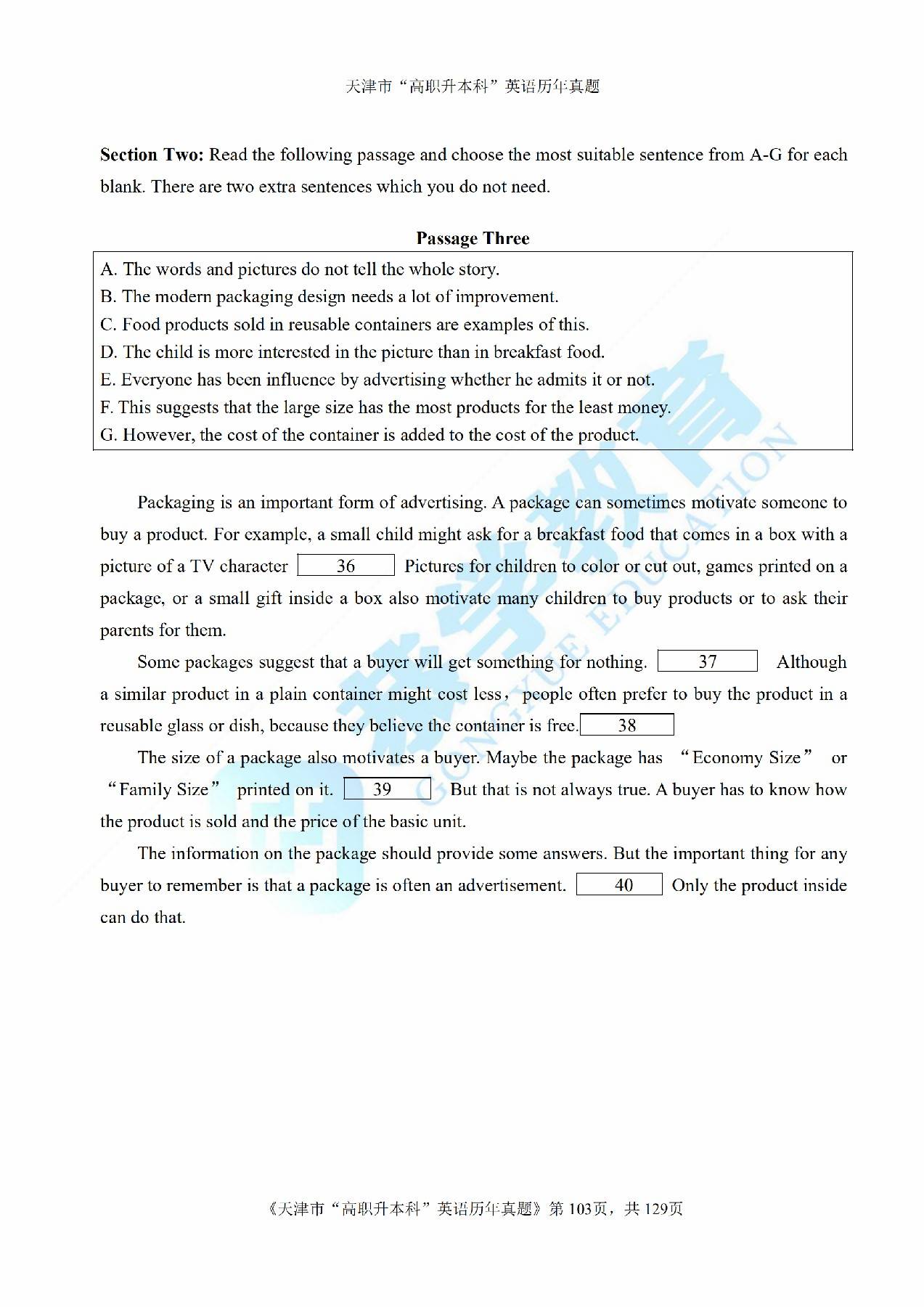 2016年天津市高等院校“高职升本科”招生统一考试大学英语真题及答案